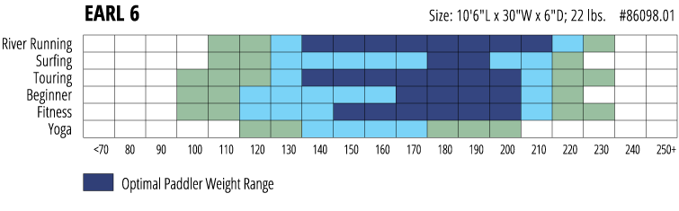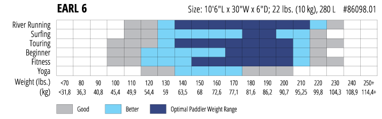 - With 280 liters of air volume, the 6-inch-thick Earl 6 provides optimal performance and stability for paddlers up to 235 pounds.