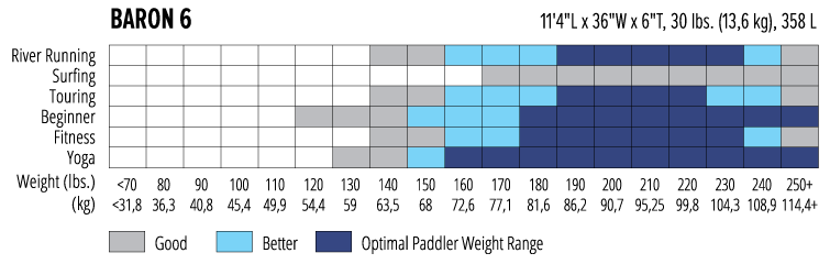 - With 358 liters of air volume, the 6-inch-thick Baron 6 is our highest-volume board, providing optimal performance and stability for paddlers up to 275 lbs.